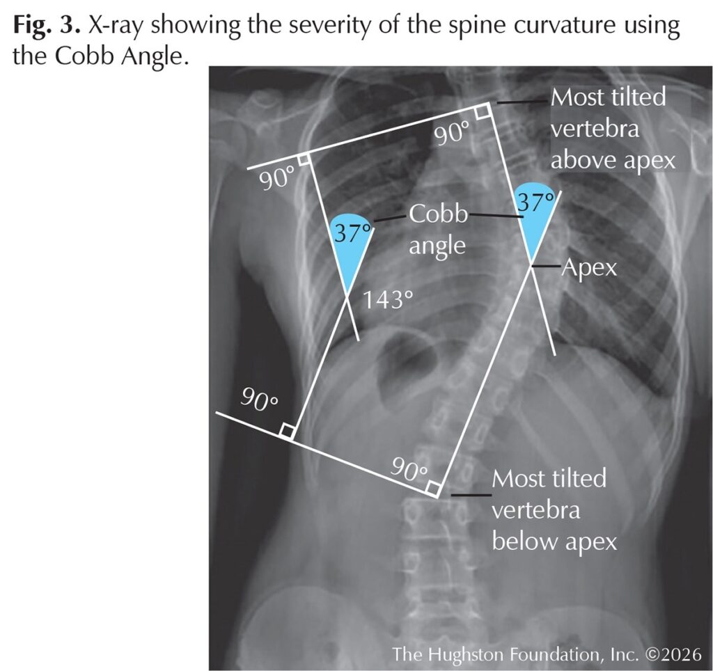 If the physician suspects scoliosis, standing x-rays of the entire spine, including frontal and side views, are ordered (Fig. 3). These images are important for visualizing the spinal curvature and confirming the diagnosis. The severity of the curvature can be measured using the Cobb angle, which is the standard method for quantifying the magnitude of the deformity. X-rays also aid with assessing the skeletal maturity of the adolescent to see whether the child is still growing, which helps predict the risk of progression. The x-ray also visually shows the physician the curve pattern, location, and direction of the curve.